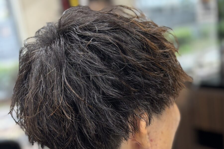 これにより、パーマ特有のランダムな動きや束感は保ちつつも、横に広がりすぎず、カールが重力に従って自然に落ちるようなシルエットを実現。